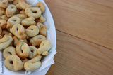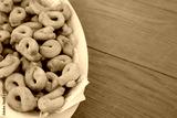 Traditional italian snack from Puglia called Taralli on a white bowl on wooden table. Selective focus
