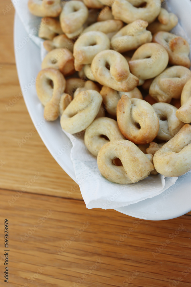 Traditional italian snack from Puglia called Taralli on a white bowl on wooden table. Selective focus