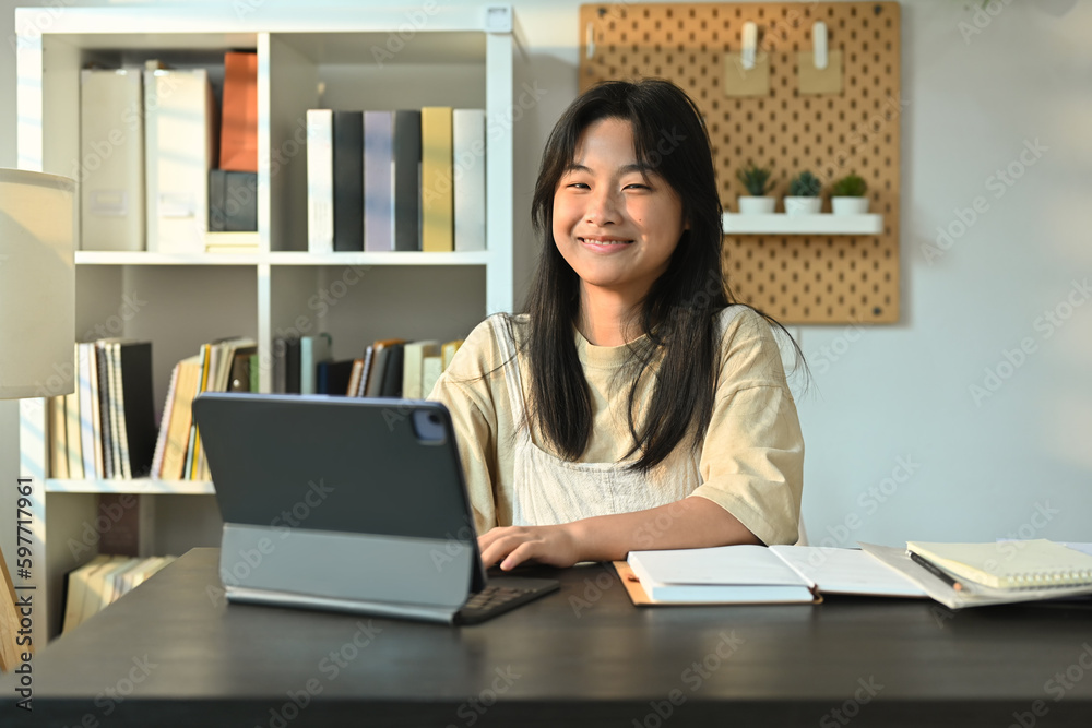 Smiling teenage girl studying online classes on digital tablet at home. Online learning, homeschooling concept