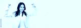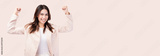 Excited young business woman raised hands celebrating success Portrait cheerful positive mix race female with raised hands and fists open mouth Girl get happy, enjoy life isolated on pink copy space