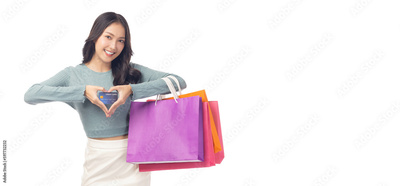 Beautiful young asian girl holding credit card shopping bags Pretty lady makes heart shaped sign by hands isolated on white background copy space Woman love shopping Shopping lady use credit card