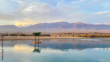 Stunning sunset on Lake Issyk-Kul, Kyrgyzstan. The calm surface of the water. Beautiful mountain seascape. Blue sky with white clouds.