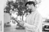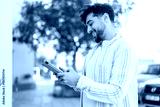Handsome Arab man at outdoors holding a tablet with happy expression