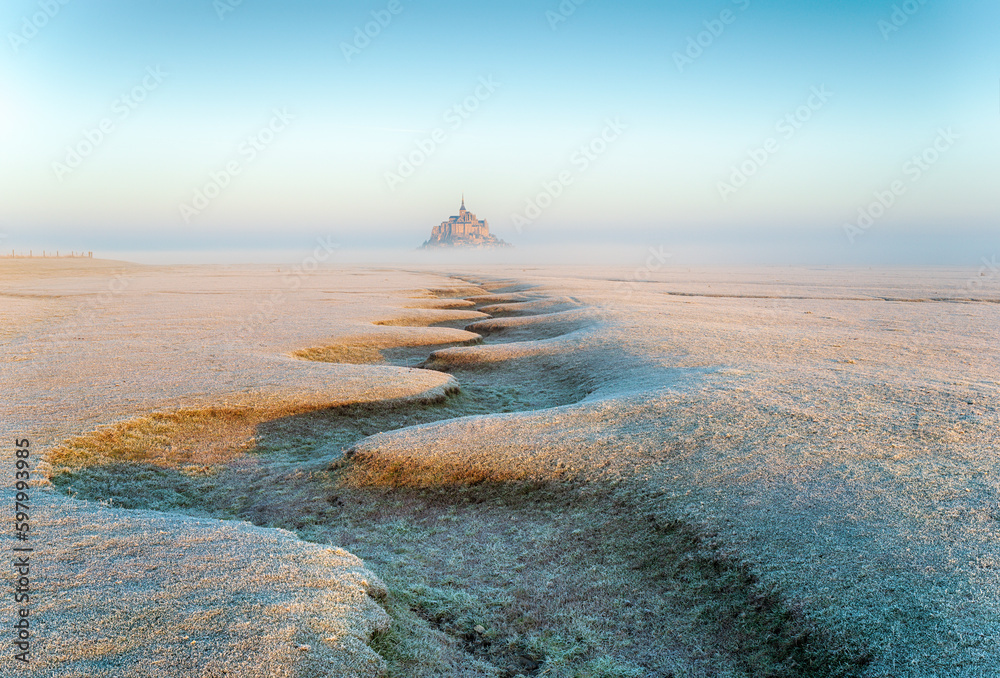 A frosty winters day on the salt marshes overlooking Mont St Michel