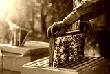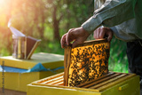 Beekeeper removing honeycomb from beehive. Person in beekeeper suit taking honey from hive. Farmer wearing bee suit working with honeycomb in apiary. Apiary as a hobby. Organic farming. Copy-space