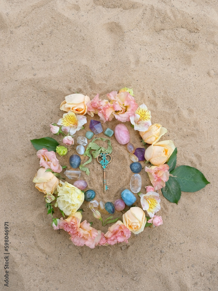 mandala made of different minerals and flowers with vintage key on sand natural background. Handmade floral arrangement. Crystal Ritual, Esoteric spiritual practice for relax, harmony. top view