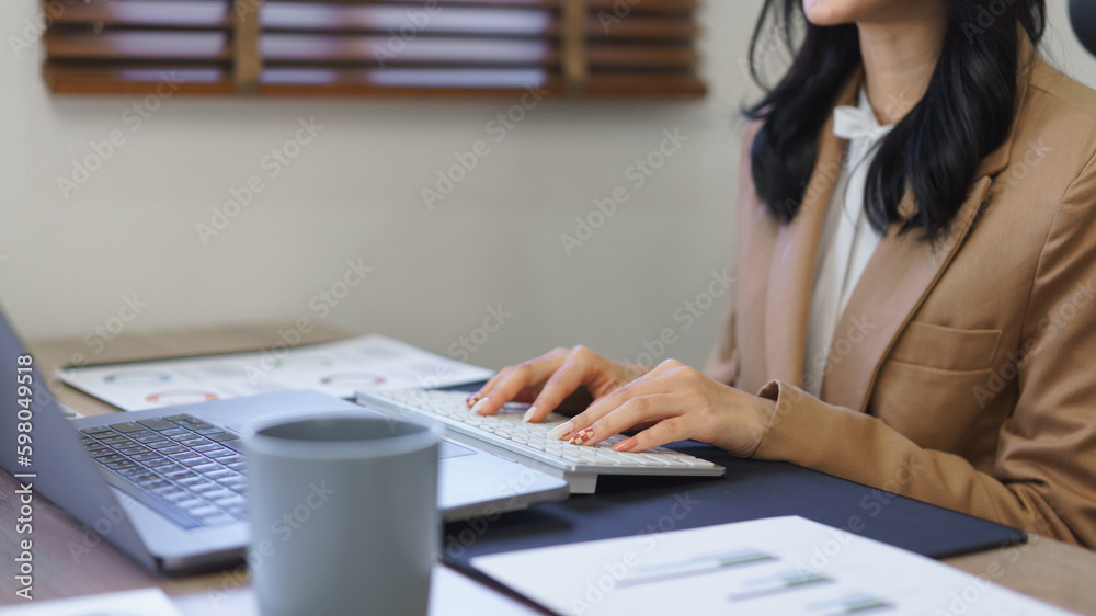 Secretary concept, Female secretary is working and typing report of business on laptop at office