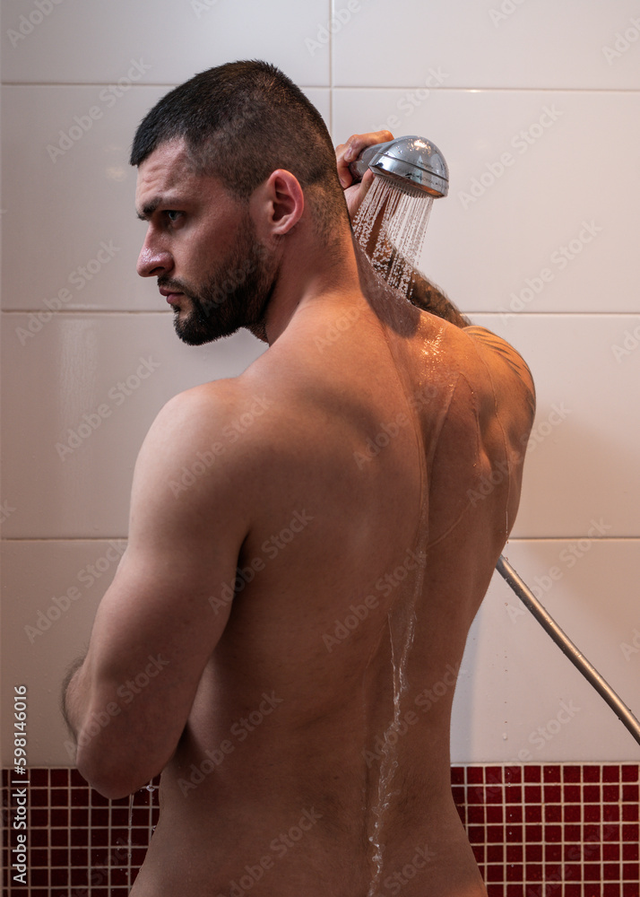 Skincare and bodycare. Young muscular man taking shower washing his body, back and shoulders. Handsome guy standing in the bathroom under hot water drops. Hygienic cleansing routine in bathroom.