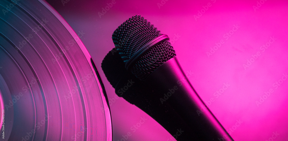 colored music background banner with microphone and vinyl record silhouettes.sound voice music show podcast disco dj karaoke concept