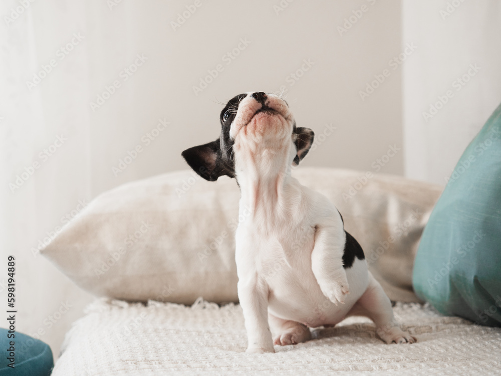 Cute puppy sitting on the bed in the living room. Clear, sunny day. Closeup, indoors. Studio photo. Day light. Concept of care, education, obedience training and raising pets