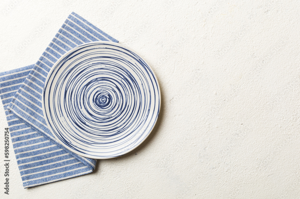 Top view on colored background empty round blue plate on tablecloth for food. Empty dish on napkin with space for your design