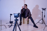 Mass media. Stylish young girl in trendy leather jacket, pants and sunglasses over retro video cameras. Old style, 80s, 90s. Concept of fashion, style, retro and vintage, gadgets, beauty, technology