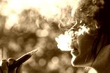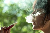 Woman exhaling white vaper smoke wrapped in a cloud of smoke on green background of a parke in the city. woman vaping electronic cigarettes in a cloud of white smoke copy space