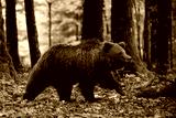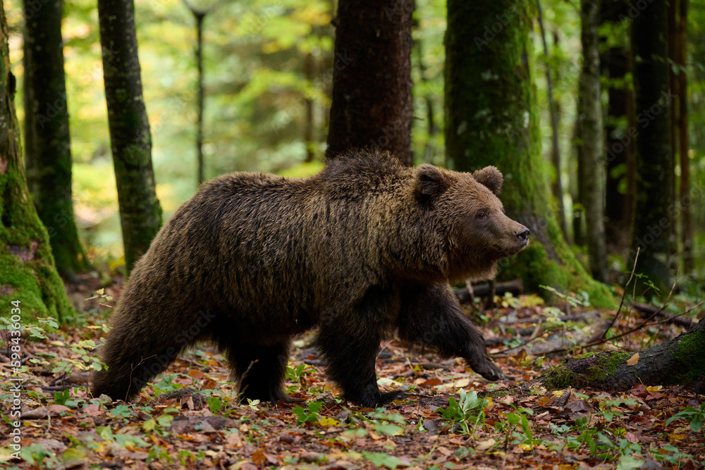 Brown bear is looking for food in a european forest. Image taken in autumn.