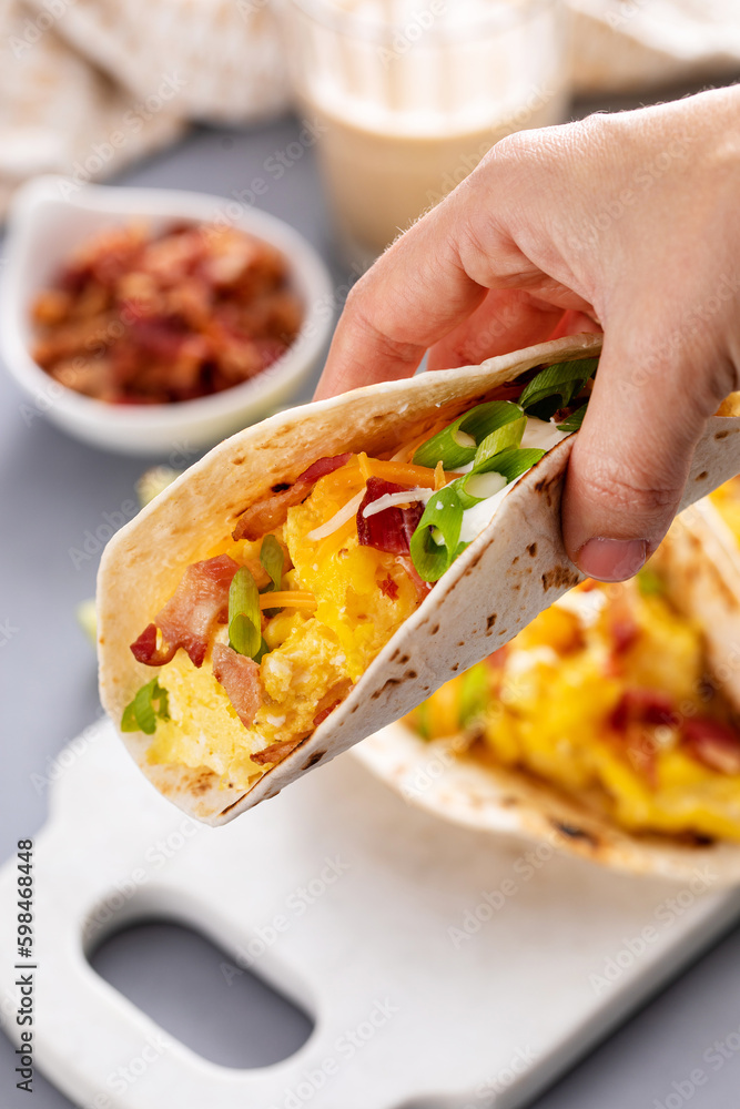Breakfast tacos with hash browns, eggs and bacon