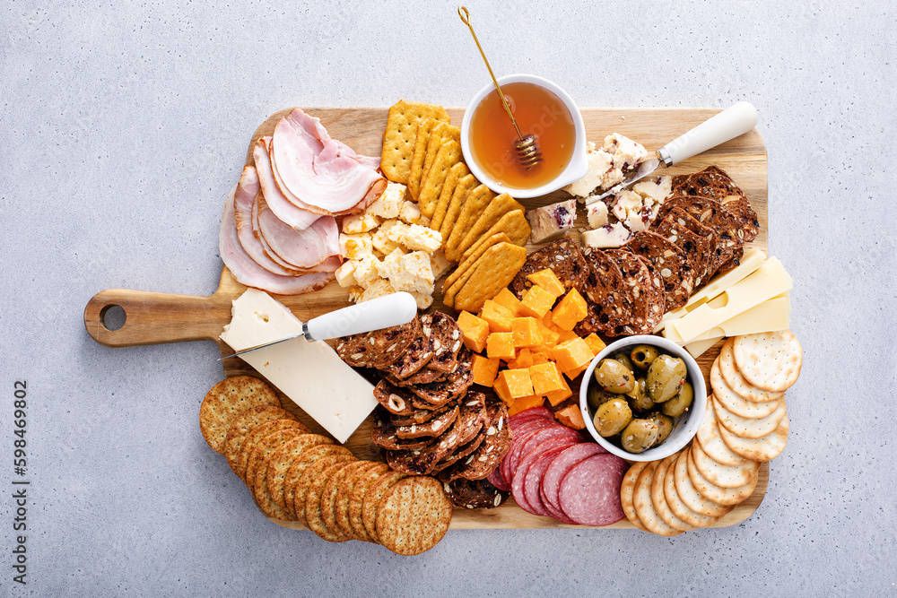 Charcuterie board or cheese board with a variety of cheeses, meat and snacks