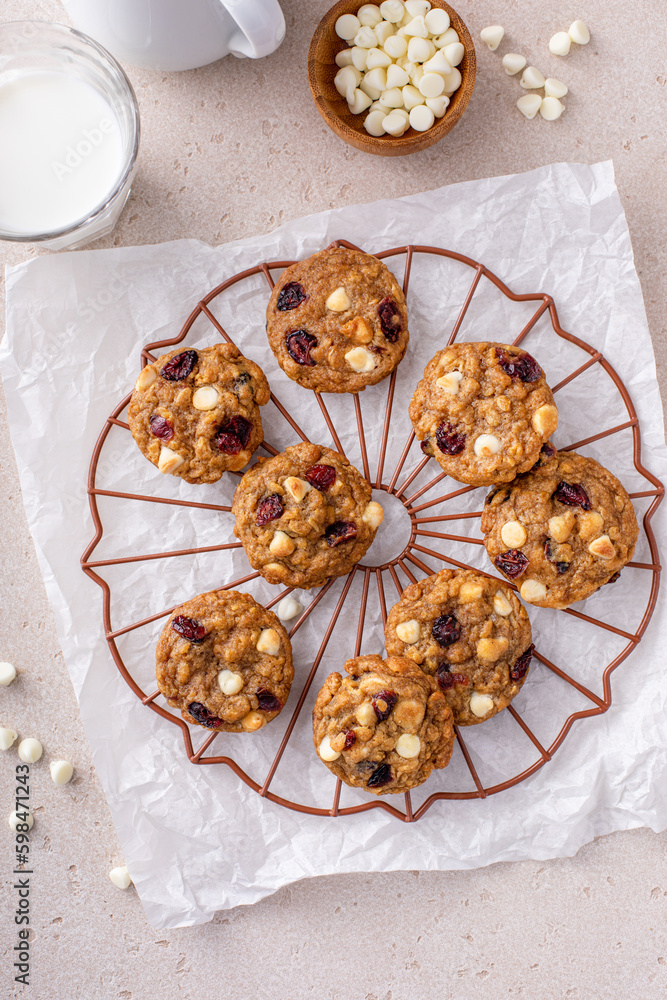 White chocolate and cranberry cookies on a cooling rack