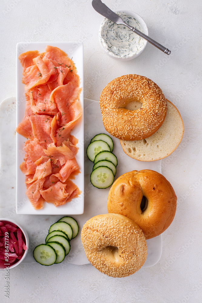 Freshly baked bagels served with dill cream cheese and salmon
