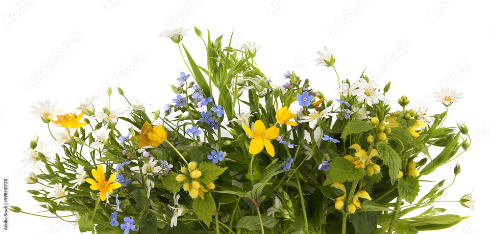 Spring flowers Greater stitchwort, Yellow archangel, Forget-me-not, yellow anemone isolated on white background. Wild flowers Rabelera holostea, Lamium galeobdolon, Myosotis, Anemonoides ranunculoides