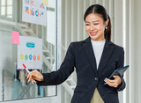 Asian professional successful female businesswoman lecturer presenter in formal business suit standing using marker pointing infographic paperwork document sticky note on glass board in meeting room