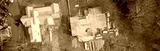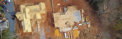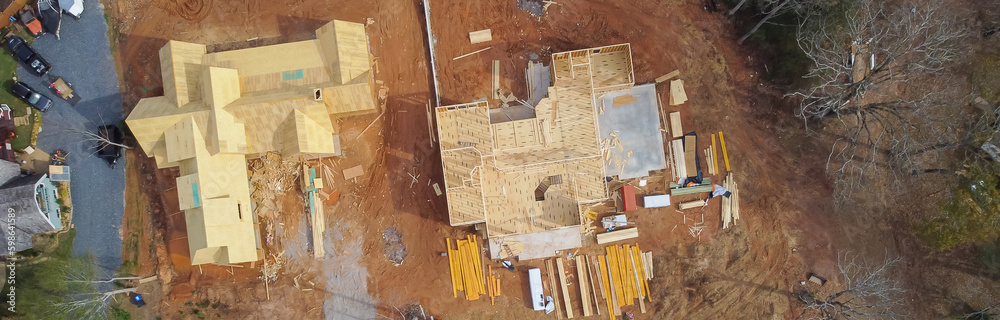 Panorama two houses under construction with building envelope and wooden frame beam, joist, trusses framework, gable roof in suburban area of Flowery Branch, Georgia, US
