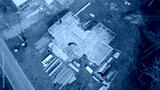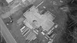 Wooden frame beam, joist, truss, plank and building materials of residential single-family house on concrete slab foundation service road in suburban area of Flowery Branch, Georgia, USA