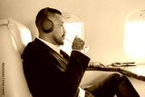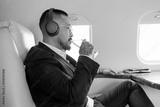 asian businessman in suit sits in private jet drinks champagne and listens to music on headphones