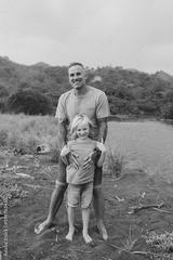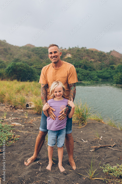 Dad standing with his son smiling at the camera in nature with water and mountains