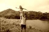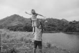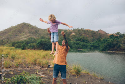 Dad throwing his son in the air with nature in the background water and mountains