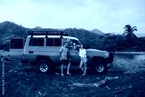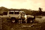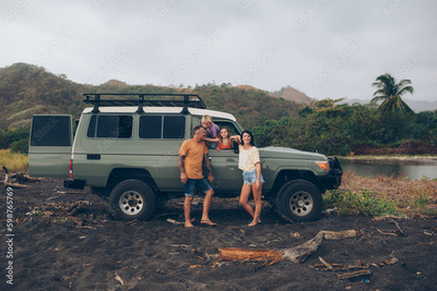 family laughing and smiling outside of their all terrain vehicle car truck at the beach