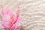 pink hibiscus with shadow over sand background, in water, abstract spa background concept banner for cosmetic body care product