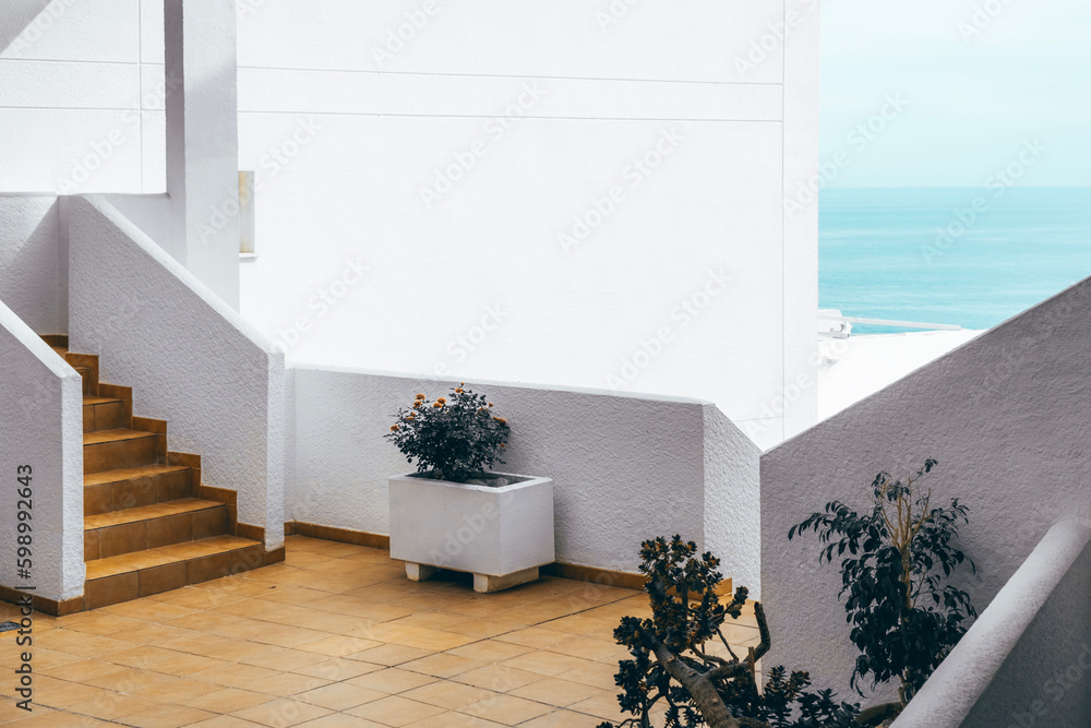 Architectural detail of white mediterranean house by the sea in sunny day. Minimal architecture building detail in Spanish coastline by Mediterranean sea in Spain
