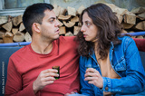 Very drunk couple, a boy and a girl, drink a strong alcoholic drink from small glasses. Bad social unhappy atmosphere