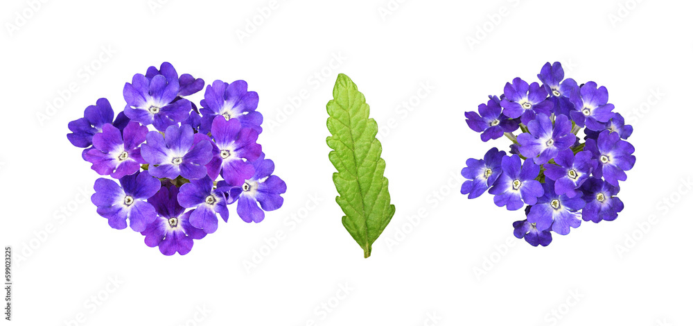 Set of purple verbena flowers and leaf isolated on white or transparent background