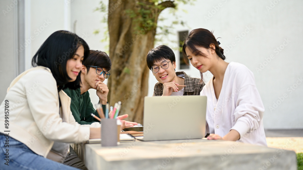 Group of happy Asian college students looking at a laptop screen, discussing their school project