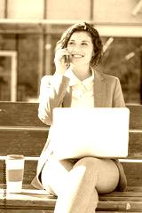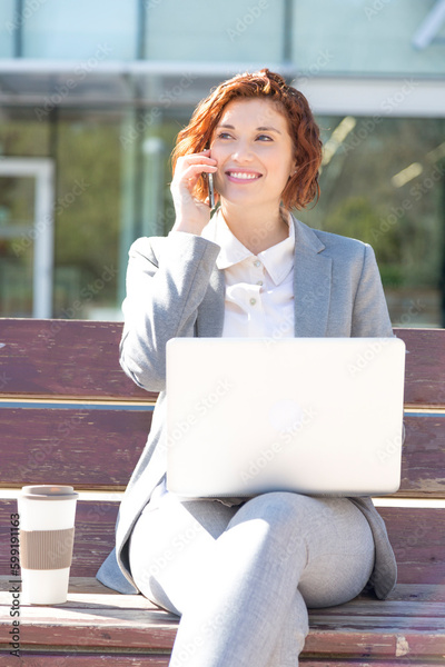 close up of red-haired businesswoman at work sitting in park talking on phone and her computer