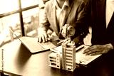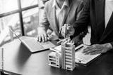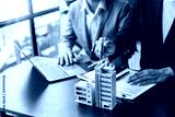 Real estate agents offer contracts to buy or rent housing. Businessman holding model small building house with property insurance at table in home sales office