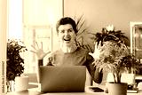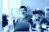 Excited happy middle aged neutral gender woman feeling winner rejoicing online win got new job opportunity, overjoyed motivated girl doing yes gesture, receive good results on pc celebrating admission