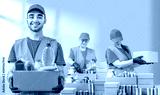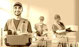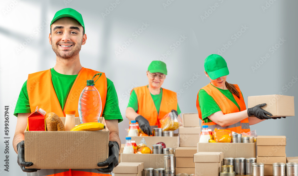 Help Collection Center, free food distribution. Volunteers wearing uniform green caps, t-shirts, orange vests prepare a food package grocery set for in-need people, sort, collect food donation boxes