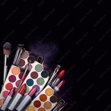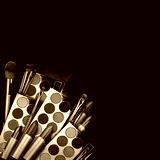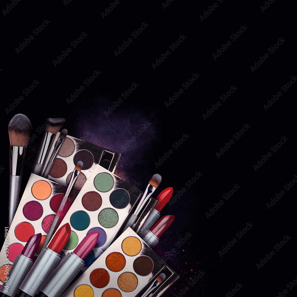 Bright eye shadow, blush brushes, explosion of multicolored powder dust on black background. Highly vibrant color-pressed pigment palettes for make-up. Abstract background for cosmetic concept.