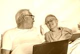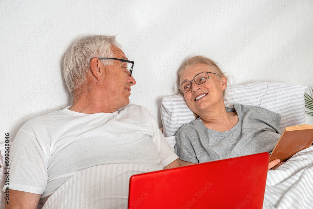 Senior couple spending leisure time in bed. A woman reads a book, a man works with a laptop while lying in the bedroom