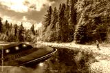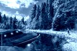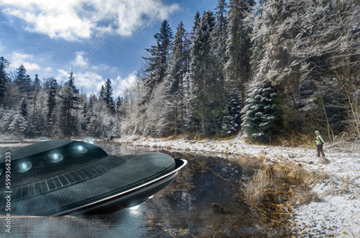 Person or child looking at UFO, broken space saucer lies in the water on the banks of a river or lake after an accident and crash. Landscape with invasion by extraterrestrial space object