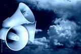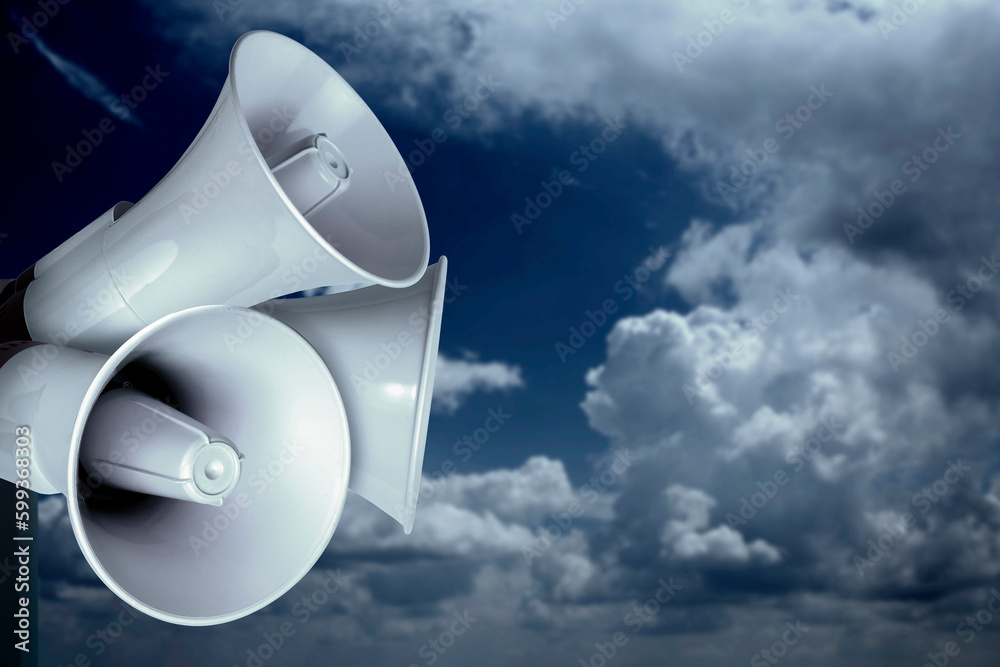 Loudhailer or megaphone. Siren, air raid alert, public hearing concept. Sky, clouds, storm with loudspeaker.