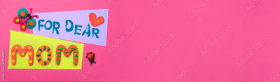 Congratulations from a child on Mother's Day. Bright hand drawn childish card with crafted plasticine colorful mom lettering, butterfly. Flat lay children's creative handmade modeling Clay