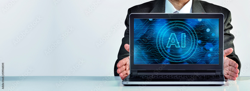 Banner with artificial intelligence conceptBusinessman with laptop with AI symbol on monitor screen.