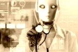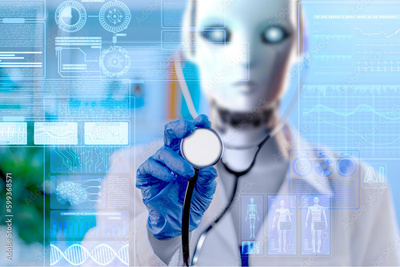 Futuristic Holographic Interface, showing medical Data in augmented reality from artificial intelligence AI. A hand in a medical glove holding a stethoscope, robot doctor in a white coat in blur