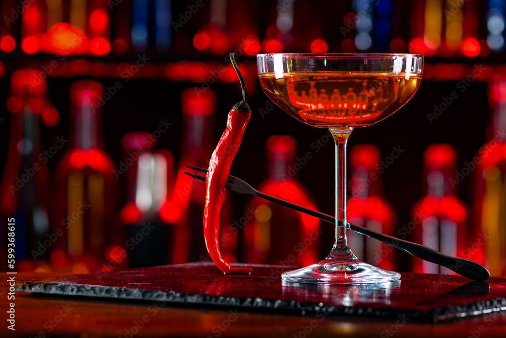 Cocktail with hot chilli pepper on bar counter in a restaurant, pub. Fresh spicy drink. Alcoholic cooler beverage at nightclub on dark background