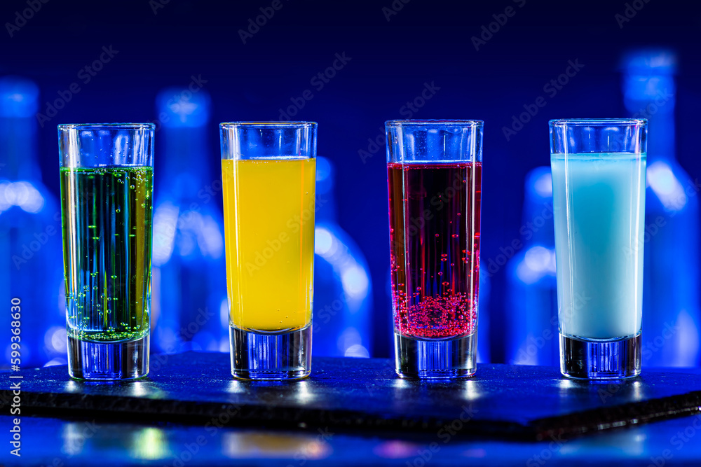 Cocktails Party Shots and Shooters on bar counter in a restaurant, pub. Miniature mixed drinks. Alcoholic cooler beverage at nightclub on dark background