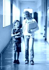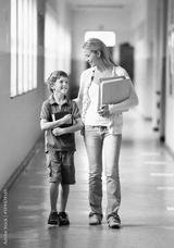 Teacher, child and walking in corridor at school, talking and bonding together. Education, smile and woman walk with kid, boy or student in hallway while going to class, speaking and discussion.