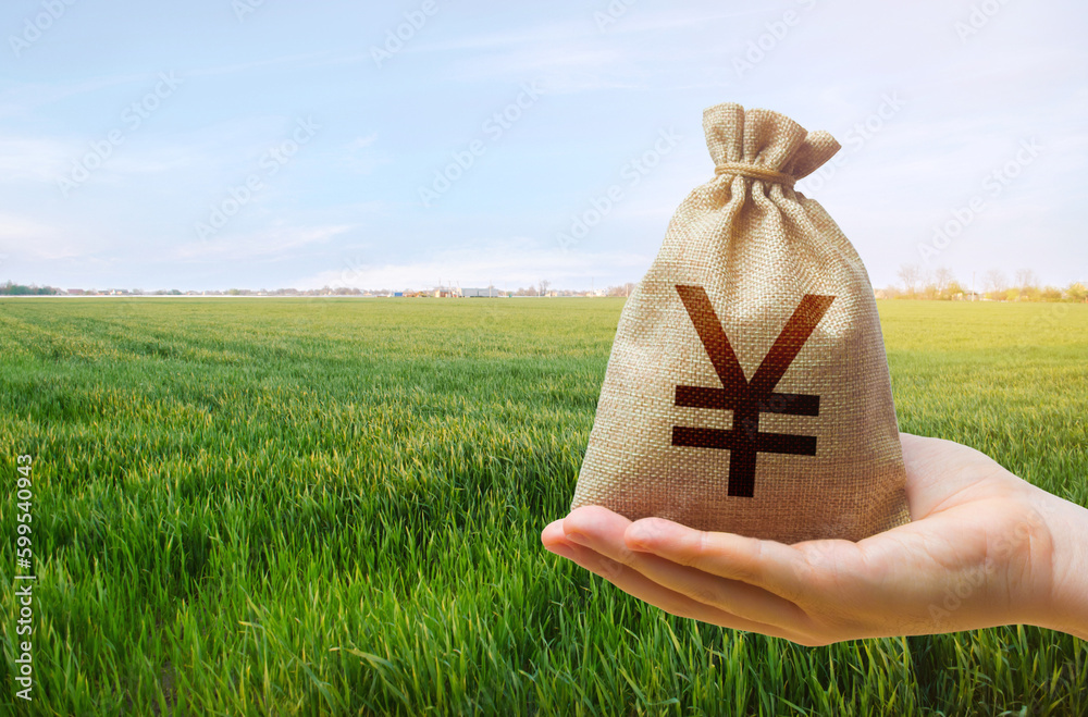 Green meadow field of young wheat and japanese yen money bag. World hunger. Grains cereals deficits. World food security crisis, high prices. Agroindustry and the agricultural business.